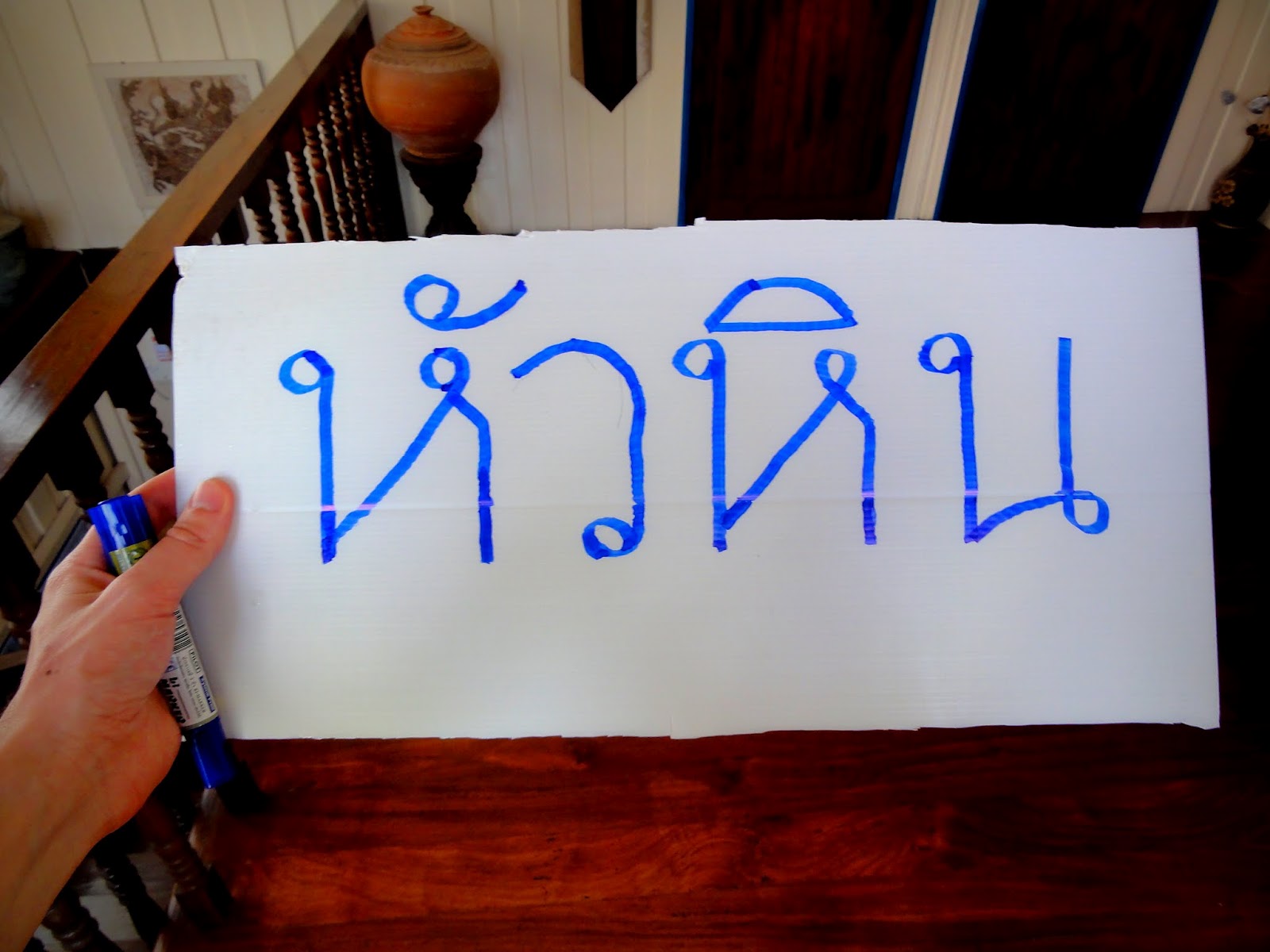 Two nights ago I met the lovely Jill who challenged me to hitchhike the next part of my journey. Nothing like a good challenge so down to the 7/11 to buy myself a marker pen, and 10 minutes later I have this. MapsWithMe has all the place names in Thai as well as English, so I just opened that up and copied out the Thai name for Hua Hin.