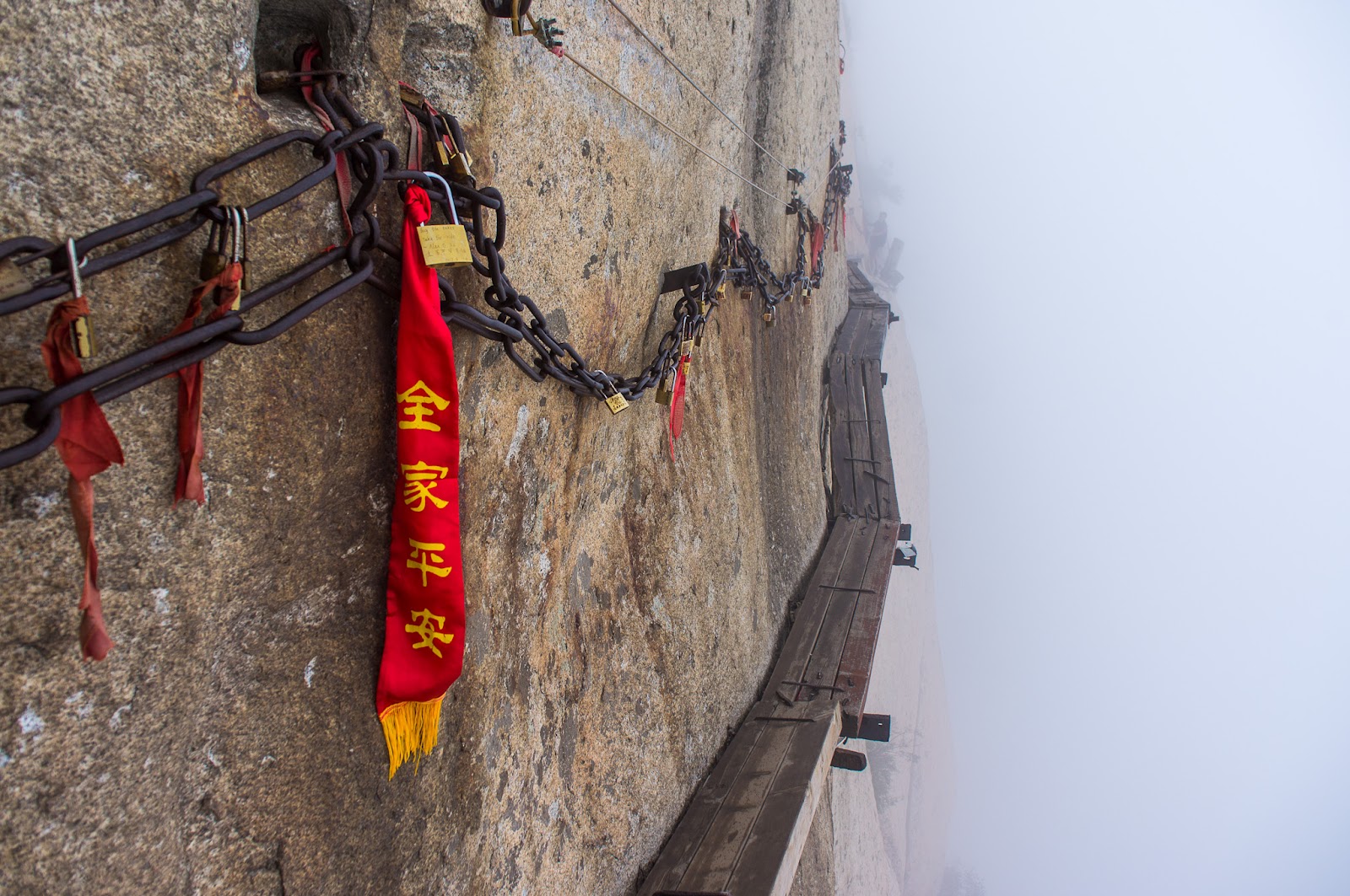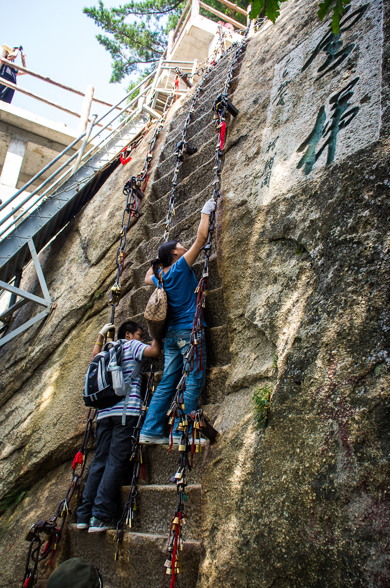 When we got to Huashan the entire mountain was shrouded in fog. I couldn’t see even close to the tops of any of the peaks. I was taking the Soldier’s Path up, which follows under where the cablecar goes. It started off with steps. Lots and Lots of steps. There’s another easier trail up that winds lazily upwards over 6km. This way was essentially 2km straight up. There were a couple of sections which were just vertical ladders of rock with chains to pull yourself up with. There were a lot of people on them, but only taking photos on the bottom few steps and then climbing up the newer, easier staircase next to them. I was the only person I saw going up the ladder. But I didn’t come halfway round the world to take the easy way out on this!!